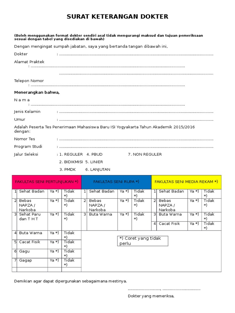 Surat keterangan tes buta warna merupakan dokumen penting yang dibutuhkan dalam berbagai kepentingan administratif seperti pendaftaran kerja atau pendaftaran sekolah. Tes buta warna sendiri dilakukan untuk mengetahui kemampuan seseorang dalam membedakan warna. Dalam proses pembuatan surat keterangan tes buta warna, seseorang harus melakukan tes buta warna terlebih dahulu dan meminta surat keterangan kepada dokter spesialis mata yang melakukan tes.