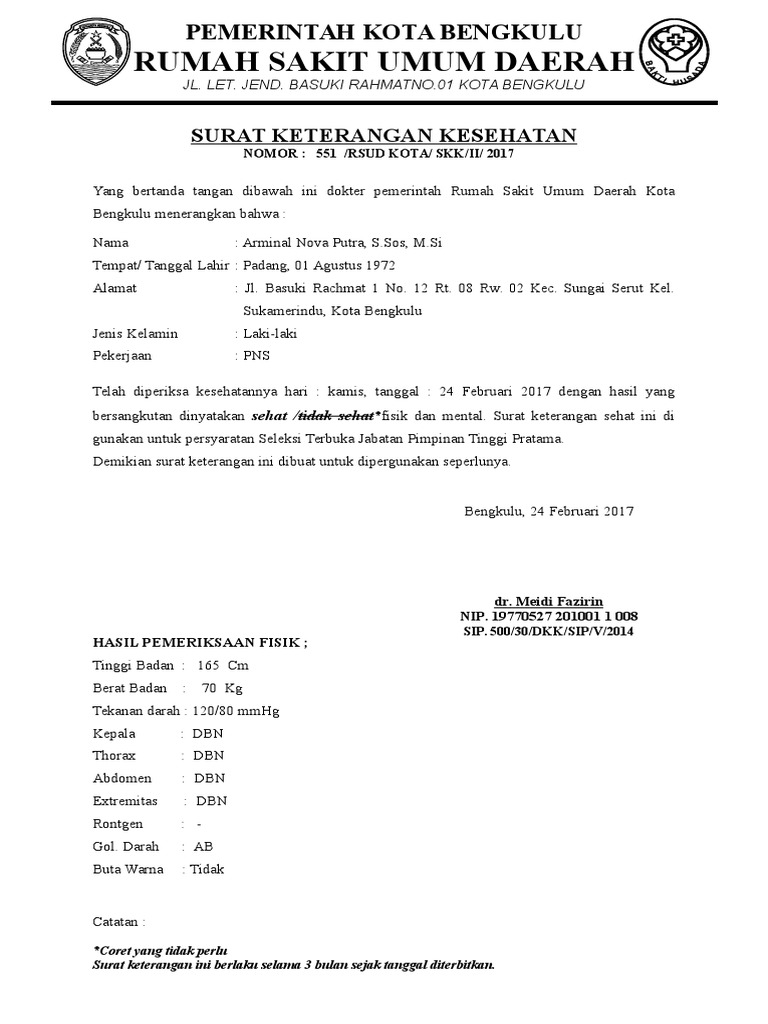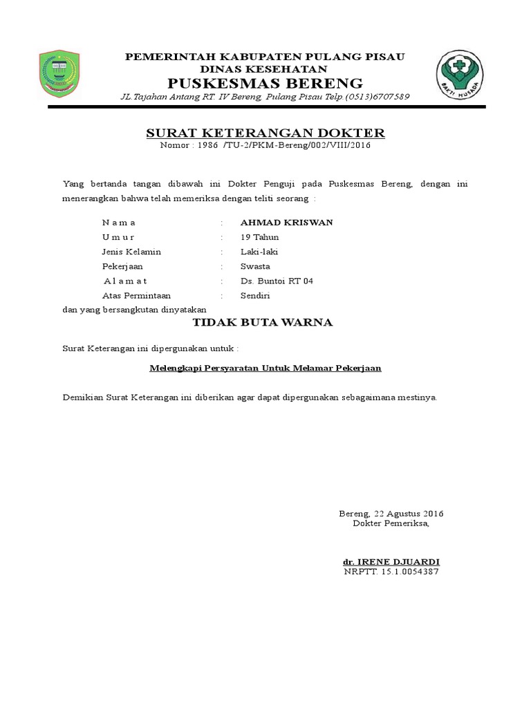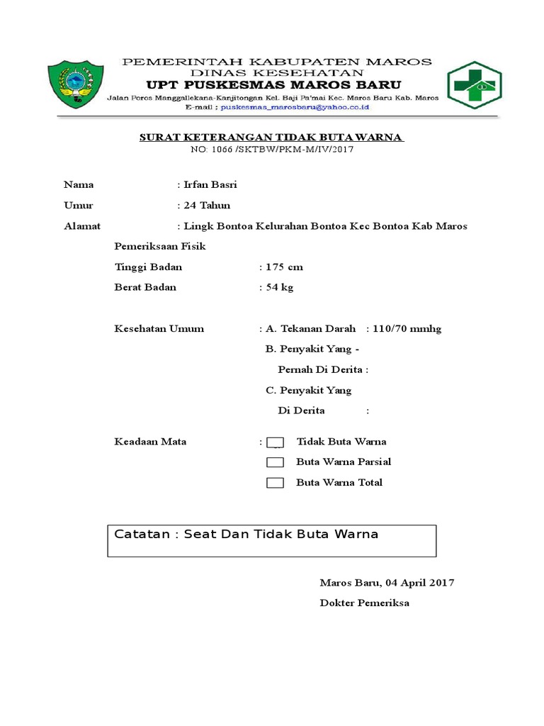 Berikut adalah contoh surat keterangan tes buta warna: